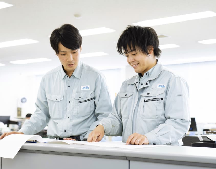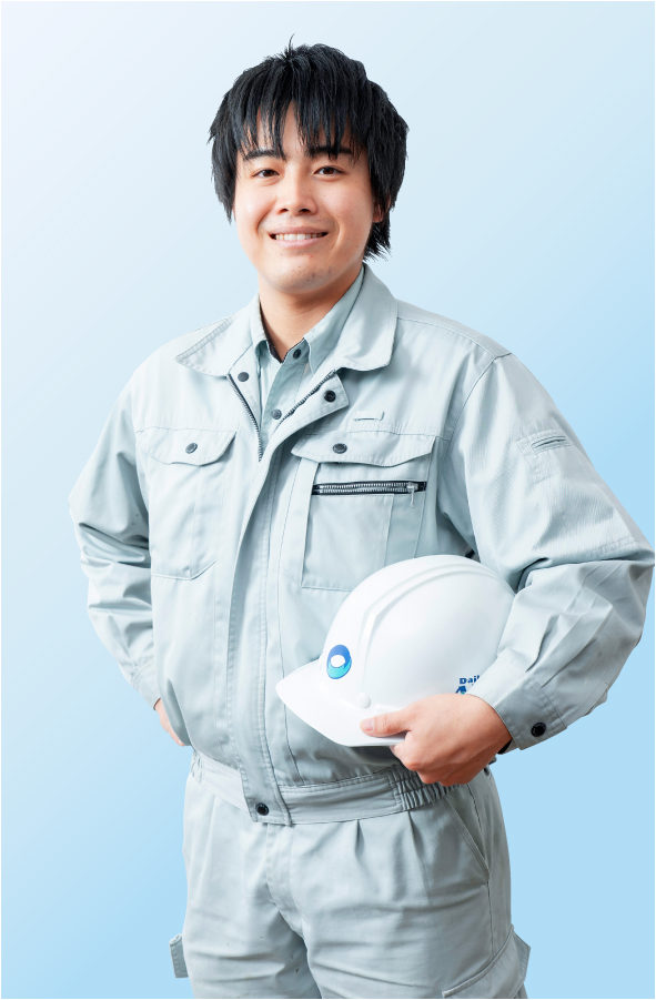 大学では化学を専攻し、水質分析の研究をしていました。水関係の仕事を探していたところダイキアクシスに出会い入社しました。建築系ではないため工事に関する知識は全くありませんでしたが、先輩や上司の現場に同行して一から教えてもらいました。マンション建設の現場にも興味がありましたし、やってみたら楽しかったというのが正直な気持ちです。特にディスポーザが付くようなマンションは現場のスケールも成果も大きいので、建物が完成して処理槽が問題なく機能してくれた時は「やった甲斐があったな」と感じます。今後は、管工事や土木工事、電気工事などの施工管理技士の資格も取得して、ますます現場で活躍できるよう精進したいです。