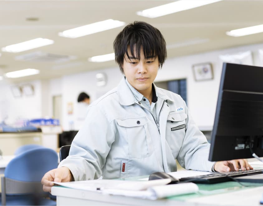 兵庫県出身。主にディスポーザ工事の施工管理(現場管理、品質管理、原価管理、工程管理、安全管理)を担当している。