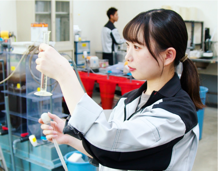 現在は主に新製品の開発にかかわる業務をしています。浄化槽の開発は1つの製品が出来上がるまでに5〜6年かかります。今、私は新型浄化槽の開発に携わっており、現在ある製品よりも良い新製品を出せないか実験をしているところです。開発職というとラボの中での細かい作業をイメージしますが、実際には屋外の実験場での作業がメインであったり、現場調査などで出張に行く機会も多くあります。また、浄化槽の維持管理方法はメーカーや浄化槽ごとに異なるため、全国各地の講習会に出かけて行き、自社製品の施工やメンテナンス方法について業者さん向けの講習なども行っています。