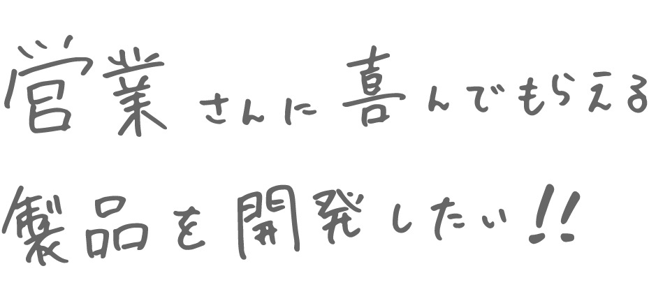 「こんな製品があったらいいな」という思いは、営業さんが一番感じていることだと思います。開発部員としては営業さんが喜んでくれる製品を開発したいと思っています。「この新製品、すごく売りやすいね」「好評だよ」と言ってもらえるような製品を開発することが私の目標です。現在はまだ周りの方に頼っている部分が多いのですが、将来的には後輩からも他部署の人からも頼られる存在になれるよう、今の気持ちを忘れずに日々頑張っていきたいです。